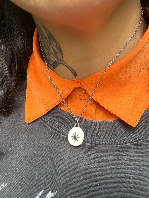 Con cadena de acero quirúrgico, dije pintado de ambos lados y esmaltado completamente.